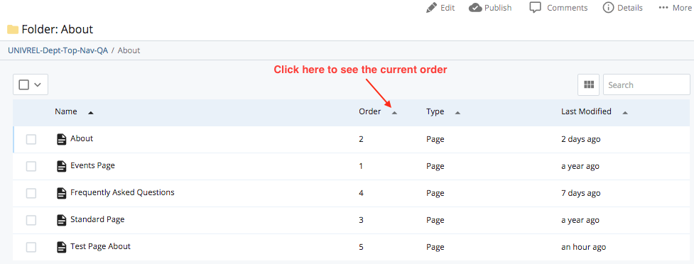 - Click the column header marked “Order.” The assets should reorder from lowest to highest. If they don’t, click “Order” again to reverse the sort order. Note that this sorting is necessary for any re-ordering to work.